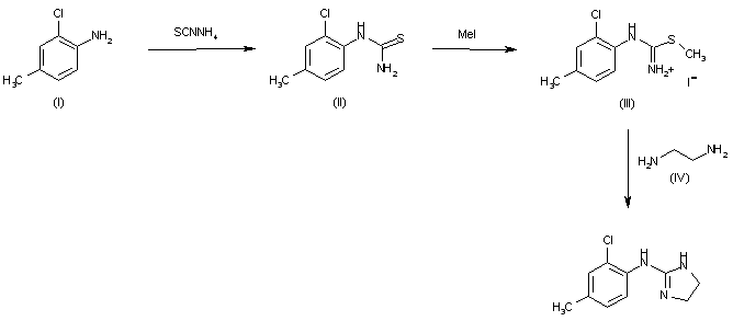 By reaction of 2-chloro-p-toluidine (I) with ammonium thiocyanide to give N-(2-chloro-p-tolyl)thiourea (II), which is then treated with methyl iodide in methanol to yield N-(2-chloro-p-tolyl)-S-methylisothiouronium iodide (III), which, without purification is condensed with ethylenediamine (IV) at 150-50 C.