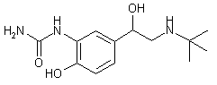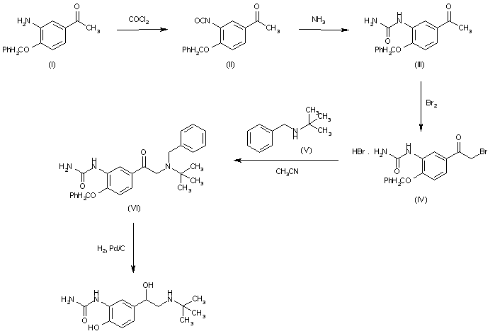 The reaction of 3-amino-4-benzyloxyacetophenone (I) with phosgene in toluene gives 3-isocyanate-4-benzyloxyacetophenone (II), which by reaction with ammonia in benzene yields 4-benzyloxy-3-ureidoacetophenone (III). The bromination of this product with Br2 in CHCl3 affords 4-benzyloxy-3-ureidophenacyl bromide (IV), amorphous product that is condensed with N-benzyl-N-tert-butylamine (V) in acetonitrile giving 4-benzyloxy-3-ureido-alpha-(N-benzyl-N-tert-butylamine)acetophenone hydrochloride (VI), m.p. 220-1 C. This product is finally hydrogenated with H2 over Pd/C in methanol
