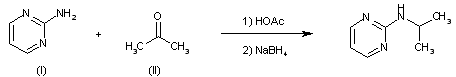 By condensation of 2-aminopyrimidine (I) with acetone (II) in acetic acid, followed by reduction with NaBH4.