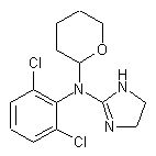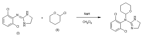 By condensation of 2-(2,6-dichlorophenylimino)imidazolidine (I) with 2-chlorotetrahydropyran (II) by means of NaH in methylene chloride.