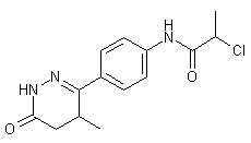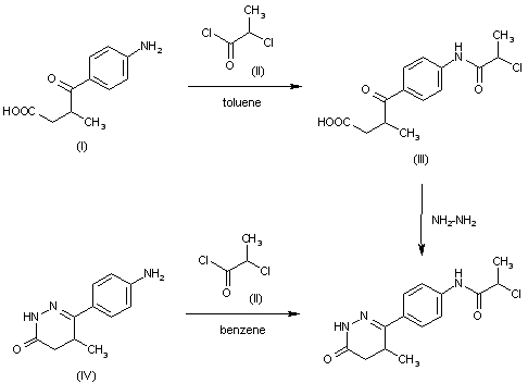 This compound can be obtained by two different ways: 1) The acylation of 2-(4-aminobenzoyl)propionic acid (I) with 2-chloropropionyl chloride (II) in hot toluene gives 2-[4-[(2-chloropropionyl)amino]benzoyl]propionic acid (III), which is then cyclized with hydrazine in refluxing ethanol. 2) By acylation of 6-(4-aminophenyl)-5-methyl-4,5-dihydro-3(2H)-pyridazinone (IV) with 2-chloropropionyl chloride (II) in refluxing benzene.