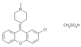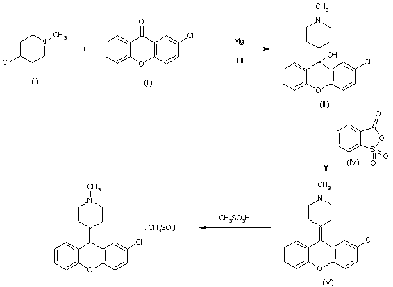 The reaction of 1-methyl-4-chloropiperidine (I) with 2-chloro-9-xanthone (II) by means of Mg in THF gives 9-(1-methyl-4-piperidyl)-2-chloroxanthene-9-ol (III), which is dehydrated by reaction with p-sulfobenzoic anhydride (IV) in refluxing propionic acid and finally treated with methane sulfonic acid.