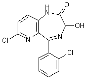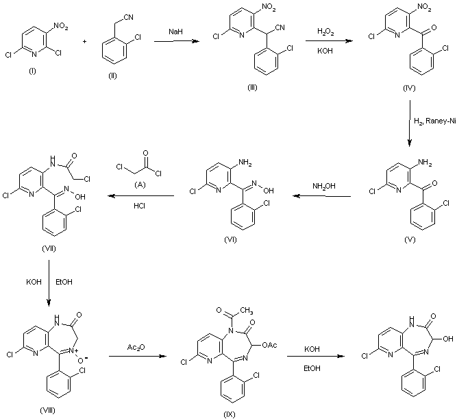 The reaction of 2,6-dichloro-3-nitropyridine (I) with 2-chlorobenzyl cyanide (II) by means of NaH in dioxane gives 2-(2-chloro-alpha-cyanobenzyl)-3-nitro-6-chloropyridine (III), which is oxidized with H2O2 and KOH in acetone yielding 2-(2-chlorobenzoyl)-3-nitro-6-chloropyridine (IV). The reduction of (IV) with H2 over Raney-Ni in dioxane affords 2-benzoyl-3-amino-6-chloropyridine (V), which is converted into 2-(2-chlorobenzoyloximino)-3-amino-6-chloropyridine (VI). The condensation of (VI) with chloroacetyl chloride (A) by means of HCl in HOAc gives 2-(2-chlorobenzoyloximino)-3-chloroacetylamino-6-chloropyridine (VII), which is cyclized by means of KOH in ethanol affording 5-(2-chlorophenyl)-7-chloro-6-aza-1,3-dihydro-2H-1,4-benzodiazepin-2-one-4-oxide (VIII) with refluxing acetic anhydride yields 1-acetyl-3-acetoxy-5-(2-chlorophenyl)-7-chloro-6-aza-1,3-dihydro-2H-1,4-benzodiazepin-2-one (IX). Finally this compound is deacetylated by treatment with KOH in ethanol at room temperature.