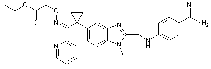 Lithiation of 2-bromopyridine (II) with BuLi, followed by addition to 1-phenylcyclopropanecarbonitrile (I), gave rise to ketone (III). Electrophilic nitration of the phenyl ring of (III) produced the nitro derivative (IV). The nitro group of (IV) was subsequently reduced by catalytic hydrogenation over Raney Ni to afford aniline (V), which was further acylated with trifluoroacetic anhydride, yielding amide (VI). A second nitration reaction in (VI) with HNO3-H2SO4 provided the nitro anilide (VII). Amide (VII) N-alkylation by means of iodomethane and K2CO3 gave the corresponding N-methyl derivative (VIII). The trifluoroacetamide function of (VIII) was then hydrolyzed under basic conditions to furnish the nitro aniline (IX), which was reduced to the phenylenediamine (X) by catalytic hydrogenation in the presence of Raney Ni. Acylation of (X) by N-(4-cyanophenyl)glycine (XI) yielded amide (XII). Benzimidazole (XIII) was then obtained by cyclization of (XII) in refluxing HOAc. The keto group of (XIII) was converted to the oxime derivative (XV) by condensation with ethyl (aminooxy)acetate (XIV). Finally, Pinner reaction of nitrile (XV) with ethanolic HCl, followed by treatment of the resulting imidate with ammonium carbonate provided the target amidine.