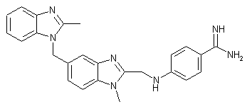 The alkylation of 2-methylbenzimidazole (I) with 4-chloro-3-nitrobenzyl chloride (II) provided adduct (III). Displacement of the chlorine atom of (III) with methylamine furnished the nitro aniline (IV), which was further reduced to phenylenediamine (V) by catalytic hydrogenation over Raney-Ni. Acylation of (V) by N-(4-cyanophenyl)glycine (VI) using N,N?carbonyldiimidazole as the activating reagent yielded amide (VII). The bis-benzimidazole compound (VIII) was then produced by cyclization of (VII) in refluxing HOAc. Finally, Pinner reaction of nitrile (VIII) with ethanolic HCl, followed by treatment of the resulting imidate with ammonium carbonate, provided the target amidine.