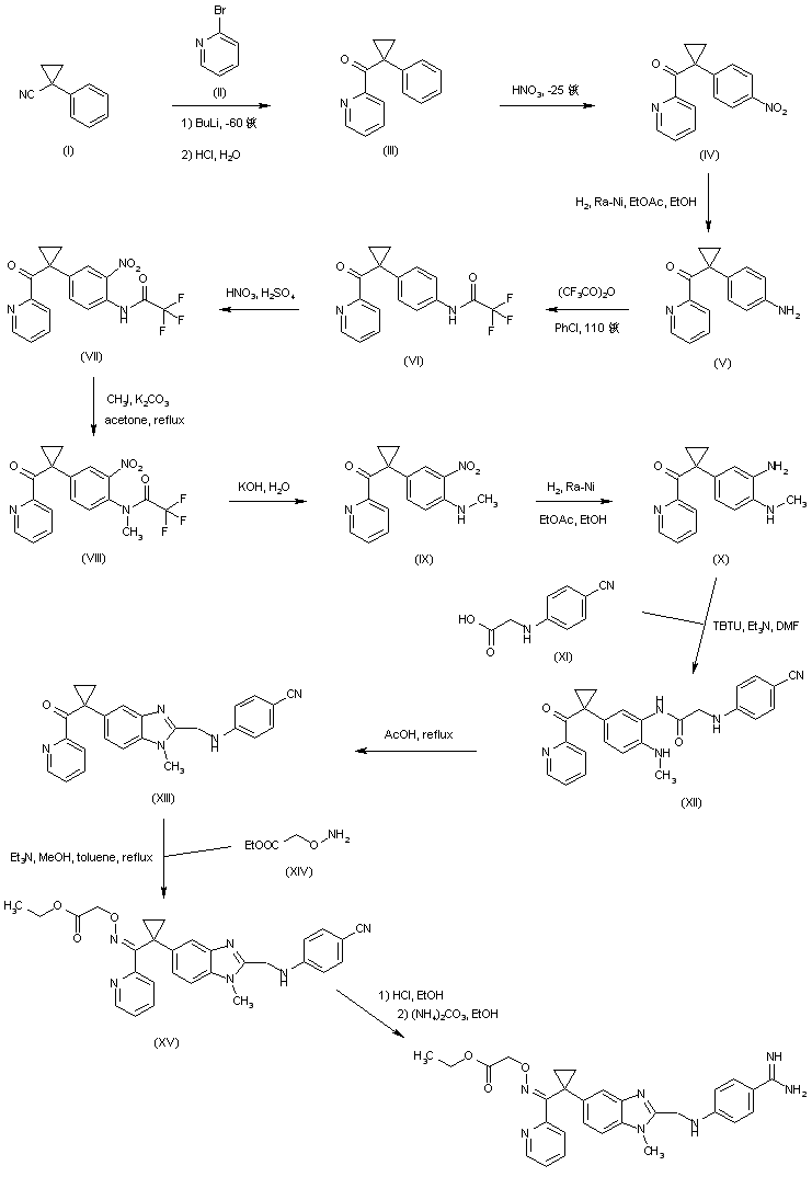Lithiation of 2-bromopyridine (II) with BuLi, followed by addition to 1-phenylcyclopropanecarbonitrile (I), gave rise to ketone (III). Electrophilic nitration of the phenyl ring of (III) produced the nitro derivative (IV). The nitro group of (IV) was subsequently reduced by catalytic hydrogenation over Raney Ni to afford aniline (V), which was further acylated with trifluoroacetic anhydride, yielding amide (VI). A second nitration reaction in (VI) with HNO3-H2SO4 provided the nitro anilide (VII). Amide (VII) N-alkylation by means of iodomethane and K2CO3 gave the corresponding N-methyl derivative (VIII). The trifluoroacetamide function of (VIII) was then hydrolyzed under basic conditions to furnish the nitro aniline (IX), which was reduced to the phenylenediamine (X) by catalytic hydrogenation in the presence of Raney Ni. Acylation of (X) by N-(4-cyanophenyl)glycine (XI) yielded amide (XII). Benzimidazole (XIII) was then obtained by cyclization of (XII) in refluxing HOAc. The keto group of (XIII) was converted to the oxime derivative (XV) by condensation with ethyl (aminooxy)acetate (XIV). Finally, Pinner reaction of nitrile (XV) with ethanolic HCl, followed by treatment of the resulting imidate with ammonium carbonate provided the target amidine.