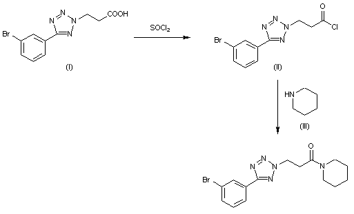 The chlorination of 3-[5-(m-bromophenyl)-2H-tetrazol-2-yl]propionic acid (I) with thionyl chloride in refluxing chloroform gives the corresponding acyl chloride (II), which is then treated with dry piperidine (III) in THF