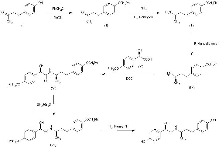 The benzylation of methyl 2-(4-hydroxyphenyl)ethyl ketone (I), with benzyl chloride and NaOH gives methyl 2-(4-benzyloxyphenyl)ethyl ketone (II), which is reductocondensed with NH3 by means of H2 over Raney-Ni in ethanol yielding 1-methyl-3-(4-benzyloxyphenyl)propylamine (III). The optical resolution of (III) with R-mandeli acid affords the R-isomer (IV), which is acetylated with R-2-(4-benzyloxyphenyl)-2-hydroxyacetic acid (V) by means of 1-hydroxybenzotriazole and dicyclohexylcarbodiimide in DMF to R,R-N-[2-(4-benzyloxyphenyl)-2-hydroxy-1-oxoethyl]-1-methyl-3-(4-benzyloxyphenyl)propylamine (VI). The reduction of (VI) with borane - dimethyl sulfide complex in THF gives R,R-N-[2-(4-benzyloxyphenyl)-2-hydroxyethyl]-1-methyl-3-(4-benzyloxyphenyl)propylamine (VII), which is finally debenzylated by hydrogenolysis with H2 over Raney-Ni in ethanol.