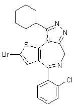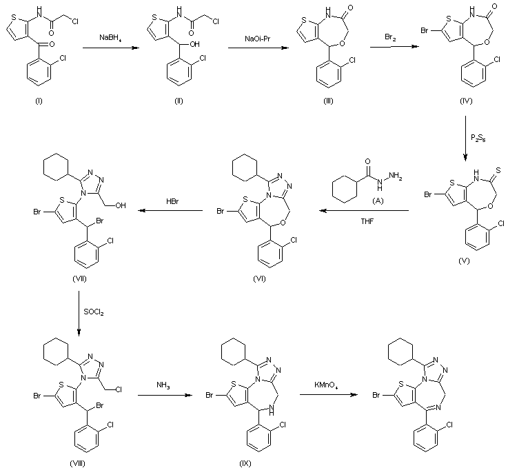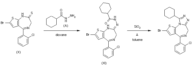 The reaction of 7-bromo-5-(o-chlorophenyl)-3H-[2,3-e]thieno-1,4-diazepine-2-thione (X) with cyclohexanecarboxyl hydrazide (A) in refluxing dioxane gives 7-bromo-5-(o-chlorophenyl)-2-(cyclohexylcarbonylhydrazino)-3H-[2,3-e]thieno-1,4-diazepine (XI), which is cyclized by treatment with SiO2 in refluxing toluene
