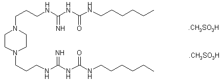 The reaction of S-methyl isothiouronium iodide (I) with n-hexyl isocyanate (II) by means of triethylamine in acetone gives N-(methylthioiminocarbonyl)-N?n-hexylurea (III), which is then condensed with 1,4-bis(3-aminopropyl)piperazine (IV) in refluxing isopropanol and methanesulfonic acid.