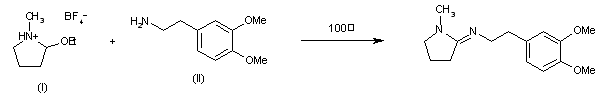By reaction of 1-methyl-2-ethoxypyrrolidinium fluoroborate (I) with 2-(3,4-dimethoxyphenyl)ethylamine (II) at 100 C.