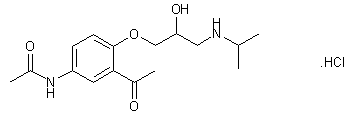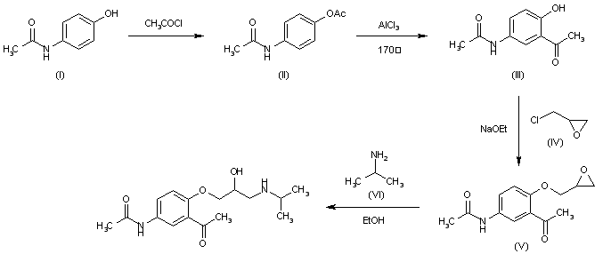 The acetylation of 4-acetamidophenol (I) with acetyl chloride in refluxing benzene gives 4-acetoxyacetanilide (II), which by a Fries reaction with AlCl3 at 170 C is converted into 2-hydroxy-5-acetamidoacetophenone (III). (1,2) The reaction of (III) with epichlorohydrin (IV) by means of sodium ethoxide in refluxing ethanol affords 1-(2-acetyl-4-acetamidophenoxy)-2,3-epoxypropane (V), which is finally treated with isopropylamine (VI) in refluxing ethanol. (1-3)