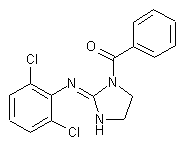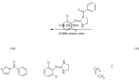 Benclonidine has been synthesized by various routes: 1) Condensation of 1-benzoylimidazolidin-2-one (II) [obtained by reaction of imidazolidin-2-one (I) with benzoyl chloride (A)] and 2,6-dichloroaniline (III) in the presence of phosphoroxy chloride at elevated temperature yields title compound. (1) 2) Clonidine (IV) reacts with benzoylimidazole (V) in aprotic solvents to give directly benclonidine. (2) 3) 2,6-Dichlorophenylisocyanide dichloride (VI) and benzoylethylenediamine (VII) are condensed in the presence of an acid acceptor to give benclonidine. (2)