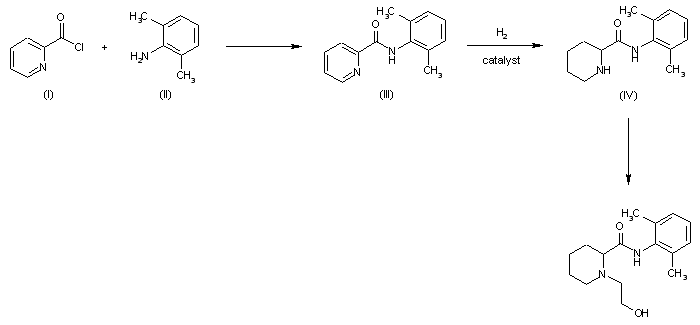 A pyridine carboxylic acid anilide (III) can be produced by reacting a pyridine carboxylic acid chloride (I) with an aromatic amine (II). The pyridine carboxylic acid anilide (III) is hydrogenated to the corresponding piperidine carboxylic acid anilide (IV), which is thereafter hydroalkylated
