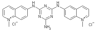 The condensation of 4,6-dichloro-1,3,5-triazin-2-amine (I) with 6-amino-1-methylquinolinium chloride (II) in refluxing ethanol/water gives the target bis quinolinium chloride.