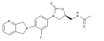 Intramolecular Diels-Alder reaction of the N-pyrazinylmethyl-N-propargyl carbamate (I), with subsequent extrusion of HCN, gave rise to a mixture of the isomeric pyrrolopyridines (II) and (III). Acidic hydrolysis of the pyrrolo[3,4-b]pyridine carbamate (III) provided the bicyclic amine (IV). This was condensed with 3,4-difluoronitrobenzene (V) to give the aryl amine (VI). Catalytic hydrogenation of the nitro group of (VI) yielded aniline (VII), which was converted to the benzyl carbamate (VIII) upon treatment with benzyl chloroformate. The chiral oxazolidinone (X) was then obtained by condensation of the lithium salt of carbamate (VIII) with (R)-glycidyl butyrate (IX) at -78 C. Conversion of alcohol (X) to mesylate (XI), and subsequent mesylate displacement with NaN3 in hot DMF, furnished azide (XII). Finally, hydrogenation of azide (XII) to the corresponding amine, followed by acylation with Ac2O, led to the target acetamide.