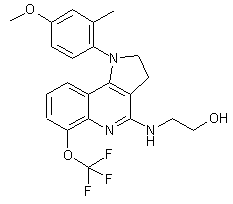 Diethyl malonate (I) was alkylated with 2-bromoethyl ethyl ether (II) to provide diethyl (2-ethoxyethyl)malonate (III). Subsequent condensation of malonate (III) with 2-(trifluoromethoxy)aniline (IV) in boiling diphenyl ether generated the furoquinoline derivative (V). This was then condensed with 2-methyl-4-methoxyaniline (VI) in refluxing diethylene glycol to furnish adduct (VII). Chlorination of pyrroloquinolone (VII) with phosphoryl chloride gave rise to the chloro pyrroloquinoline (VIII). The chloro group of (VIII) was finally displaced with ethanolamine (IX) at 190 C, yielding the title compound.