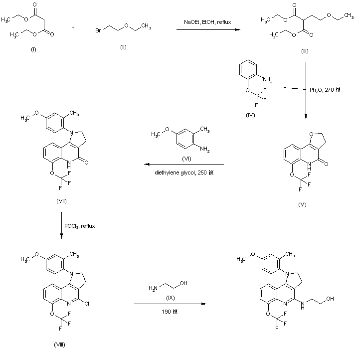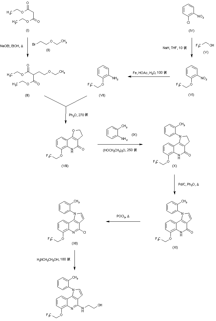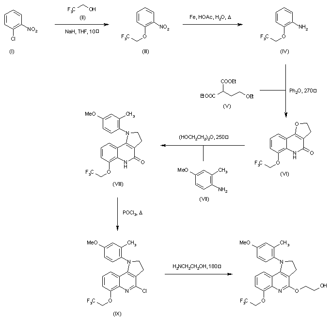 Reaction of 2-chloronitrobenzene (I) with the sodium alkoxide of 2,2,2-trifluoroethanol (II) in cold THF afforded trifluoroethyl ether (III). The nitro group of (III) was then reduced by means of iron and AcOH to produce 2-(trifluoroethoxy)aniline (IV). Condensation of (IV) with diethyl (2-ethoxyethyl)malonate (V) in boiling diphenyl ether led to the furoquinolinone system (VI), and subsequent reaction of (VI) with 2-methyl-4-methoxyaniline (VII) in refluxing diethylene glycol generated the pyrroloquinolinone (VIII). Chlorination of (VIII) with POCl3 gave chloropyrroloquinoline (IX). Finally, displacement of the chlorine of (IX) by ethanolamine at 180 C yielded the title compound.