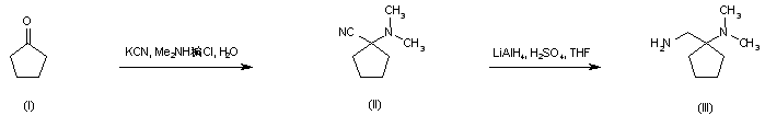 Aminonitrile (II) was prepared by Strecker reaction of cyclopentanone (I) with potassium cyanide and dimethylamine hydrochloride. Subsequent reduction of (II) with alane, generated in situ from LiAlH4 and H2SO4, produced diamine (III).