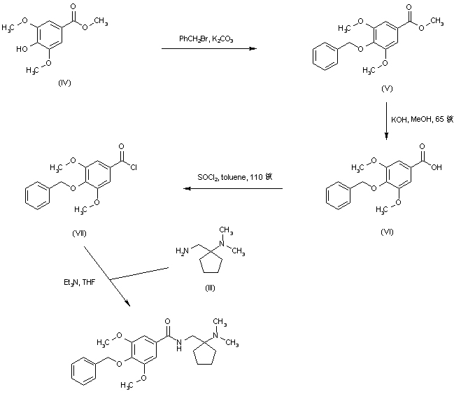 Alkylation of methyl 4-hydroxy-3,5-dimethoxybenzoate (IV) with benzyl bromide afforded the corresponding 4-benzyloxy derivative (V). After basic hydrolysis of the methyl ester group of (V), the resultant carboxylic acid (VI) was converted to acid chloride (VII) using thionyl chloride in refluxing toluene. Then, acylation of diamine (III) with acid chloride (VII) afforded the title amide.