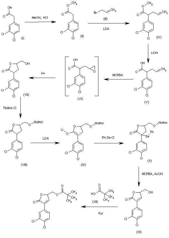 The esterification of 3,4-dichlorophenylacetic acid (I) with methanol and ClH gives the methyl ester (II), which is alkylated with allyl bromide and LDA in THF to yield 2-(3,4-dichlorophenyl)-4-pentenoic acid methyl ester (IV). The hydrolysis of (IV) with LiOH in MeOH/water affords the corresponding free acid (V), which is epoxidated with MCPBA in refluxing chloroform to provide epoxide (VI), which, without isolation, is treated in acid medium, giving the tetrahydrofuranone (VII). The silylation of the OH group of (VII) with Tbdms-Cl and imidazole in DMF yields the protected silyl ether (VIII), which is treated with LDA in THF to afford the lithium enolate (IX). The reaction of (IX) with phenylselenyl chloride in THF provides the phenylselenyl derivative (X), which is oxidized with MCPBA to the corresponding selenoxide. This nonisolated compound undergoes spontaneous syn elimination to give, after hydrolysis of the silyl ether with AcOH, 3-(3,4-dichlorophenyl)-5-(hydroxymethyl)furan-2(5H)-one (XI). Finally, this compound is esterified with pivaloyl chloride and pyridine in dichloromethane to afford the target ester.