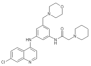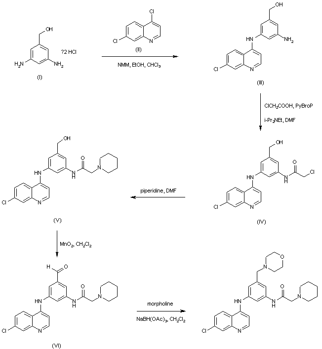 The intermediate anilinoquinoline (III) was obtained by nucleophilic substitution of 4,7-dichloroquinoline (II) with 3,5-diaminobenzyl alcohol (I) in the presence of N-methylmorpholine. Coupling of (III) with chloroacetic acid gave the corresponding chloroacetamide (IV), which was further reacted with piperidine in DMF, yielding the piperidino acetamide (V). The benzyl alcohol function of (V) was then oxidized to aldehyde (VI) employing manganese dioxide. Finally, reductive condensation of aldehyde (VI) with morpholine in the presence of NaBH(OAc)3 furnished the title compound.