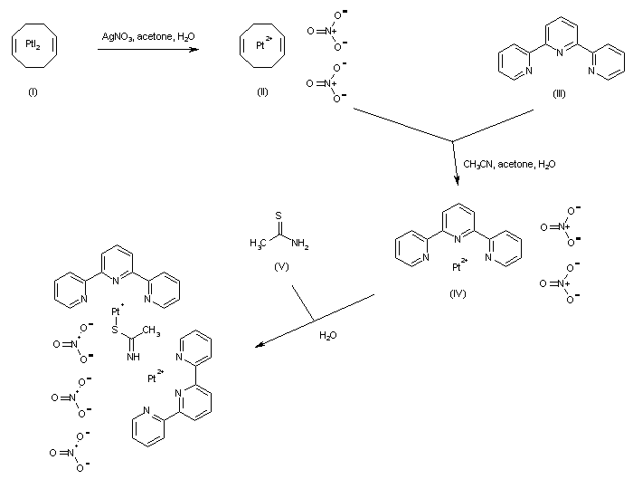 The exchange reaction of (1,5-cyclooctadiene)diiodoplatinum (I) with silver nitrate produced the platinum nitrate derivative (II). Complexation of (II) with 2,2':6',2''-terpyridine (III) produced the terpyridine-platinum complex (IV), which was subsequently treated with thioacetamide (V) to furnish the title compound.