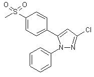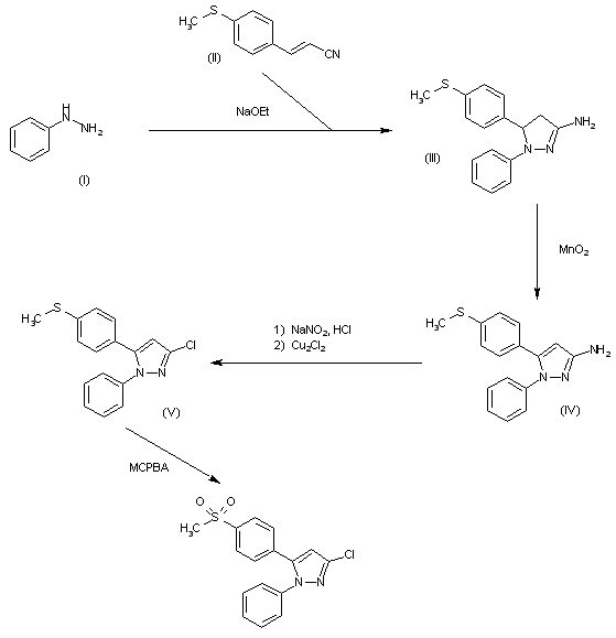 The cyclization of phenylhydrazine (I) with 3-[4-(methylsulfanyl)phenyl]acrylonitrile (II) by means of NaOEt in refluxing ethanol gives the aminopyrazoline (III), which is dehydrogenated by means of MnO2 in dichloromethane to yield the 3-aminopyrazole (IV). The diazotation of (IV) with NaNO2 and HCl in water, followed by a treatment with Cu2Cl2, affords the 3-chloropyrazole (V), which is finally oxidized to the target sulfone by means of MCPBA in dichloromethane.