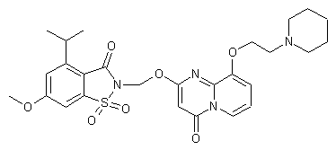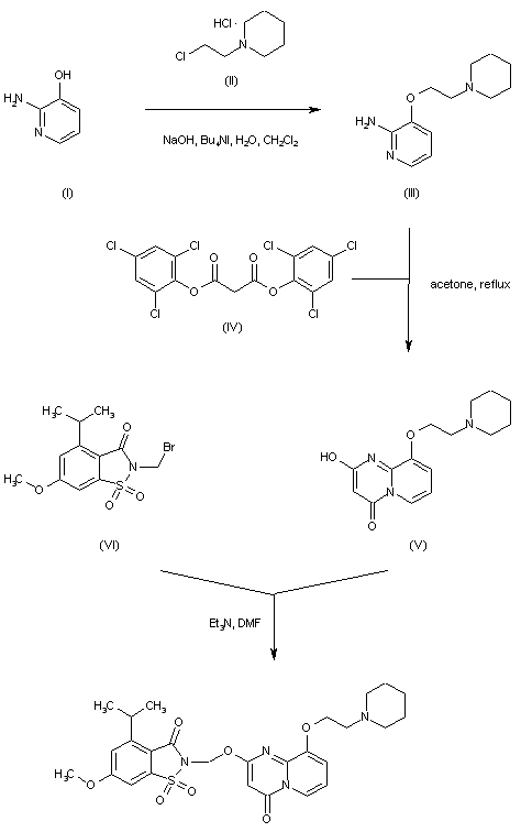 2-Amino-3-hydroxypyridine (I) is alkylated with N-(2-chloroethyl)piperidine (II) under phase transfer conditions to provide ether (III). Subsequent cyclization of aminopyridine (III) with bis-trichlorophenyl malonate (IV) in refluxing acetone leads to the pyridopyrimidine (V). This is finally condensed with the N-(bromomethyl)saccharin derivative (VI) to furnish the title compound.