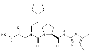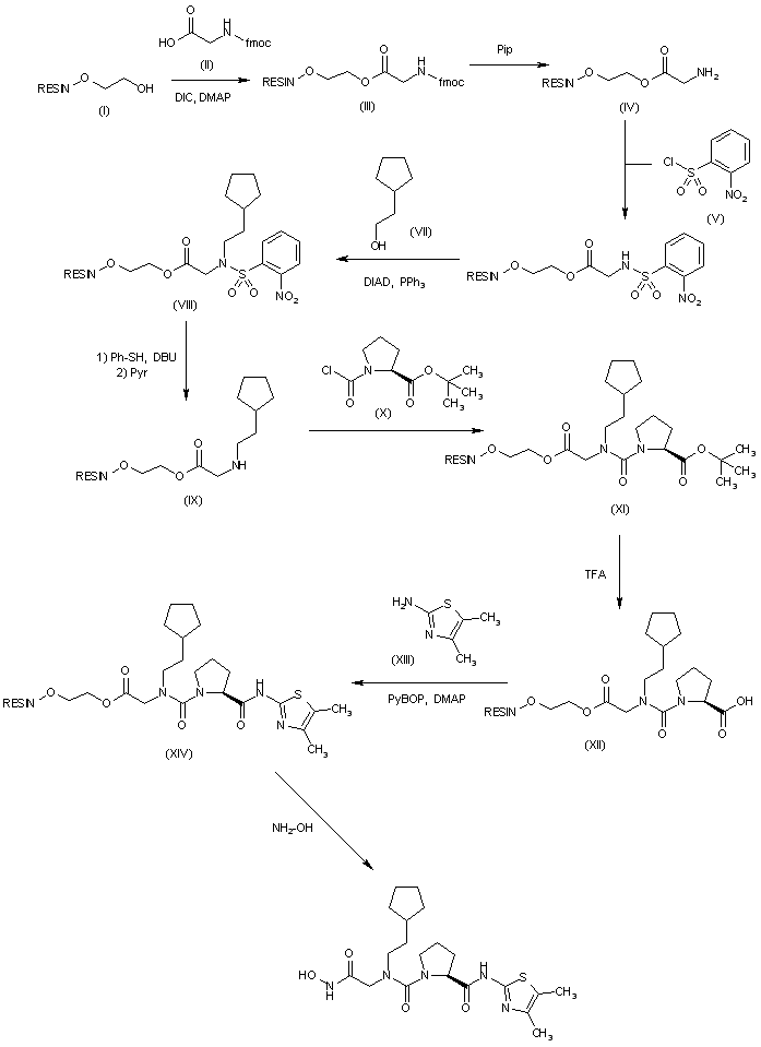 The condensation of ArgoGel-OH resin (I) with N-(Fmoc)-glycine (II) by means of DIC and DMAP gives the resin-bound Fmoc-glycine (III), which is deprotected with piperidine to yield the resin-bound glycine (IV). The reaction of (IV) with 2-nitrophenylsulfonyl chloride (V) affords the sulfonamide (VI), which is alkylated with 2-cyclopentylethanol (VII) by means of DIAD and PPh3 to provide the N-alkylated sulfonamide (VIII). The reaction of (VIII) with Ph-SH, DBU and pyridine gives the N-alkylated resin-bound glycine (IX), which is condensed with 1-(chlorocarbonyl)-L-proline tert-butyl ester (X) to yield the resin-bound dipeptide tert-butyl ester (XI). Hydrolysis of the ester group of (XI) with TFA affords the free resin-bound dipeptide (XII), which is condensed with 4,5-dimethylthiazole-2-amine (XIII) by means of PyBOP and DMAP to provide the corresponding prolinamide (XIV). Finally, this compound is treated with hydroxylamine in order to cleave the title compound from the resin by formation of the desired hydroxamic acid.