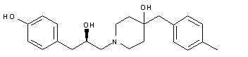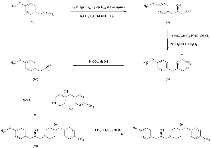 Sharpless asymmetric catalytic dihydroxylation of 4-allylanisole (I) using (DHQD)2AQN as the chiral ligand provided diol (II). Condensation of diol (II) with trimethyl orthoacetate in the presence of pyridinium tosylate, followed by treatment with acetyl bromide, afforded bromo ester (III), which was subsequently transformed into the chiral epoxide (IV) with K2CO3 in MeOH. Epoxide (IV) opening with 4-(4-methylbenzyl)piperidin-4-ol (V) gave amino alcohol (VI). The methyl ether group of (VI) was finally cleaved by treatment with boron tribromide.
