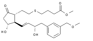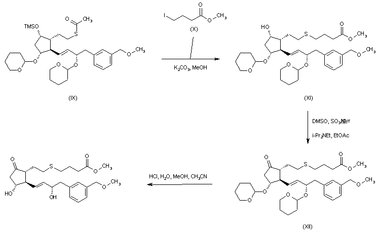 Methanolysis of the thioacetate and silyl ether groups of (IX), with concomitant S-alkylation by methyl 4-iodobutyrate (X) lead to thioether (XI). The deprotected alcohol function of (XI) is then oxidized to ketone (XII) under modified Swern conditions. Subsequent acidic hydrolysis of the tetrahydropyranyl ether groups of (XII) provide diol (XIII). Finally, hydrolysis of ester (XIII) to the target carboxylic acid is performed employing pig liver esterase.