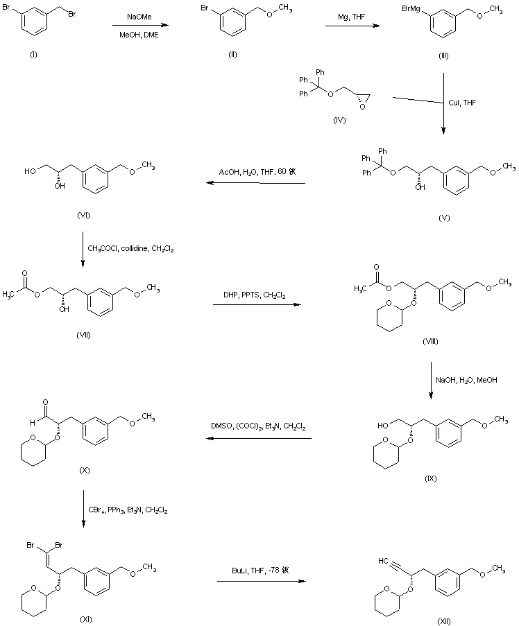 Treatment of 3-bromobenzyl bromide (I) with sodium methoxide gives 1-bromo-3-(methoxymethyl)benzene (II). After conversion of aryl bromide (II) into the corresponding Grignard reagent (III), addition to epoxide (IV) in the presence of CuI affords the chiral alcohol (V). Removal of the O-trityl protecting group of (V) under acidic conditions provides diol (VI), which is selectively acylated at the primary hydroxyl group by means of acetyl chloride and 2,4,6-collidine to produce the mono-acetate (VII). After protection of the secondary hydroxyl group of (VII) as the tetrahydropyranyl ether (VIII), alkaline hydrolysis of the acetate ester group leads to the primary alcohol (IX). Subsequent Swern oxidation of alcohol (IX) provides aldehyde (X). Condensation of aldehyde (X) with tetrabromomethane in the presence of triphenylphosphine furnishes the gem-dibromoolefin (XI). This is then converted to the terminal alkyne (XII) by treatment with butyllithium in cold THF.