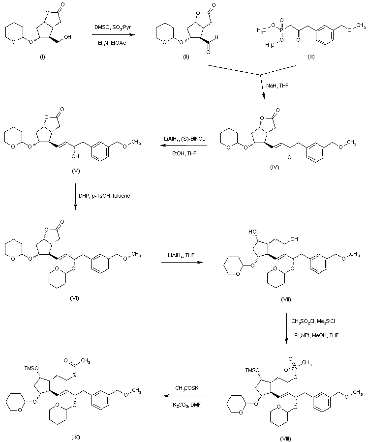 In an alternative method, oxidation of the lactone alcohol (I) using DMSO in the presence of SO3-pyridine complex gives aldehyde (II). Horner-Emmons condensation of aldehyde (II) with phosphonate (III) affords enone (IV). Stereoselective reduction of (IV) with LiAlH4 in the presence of (S)-BINOL provides the (S)-alcohol (V), which is further protected with dihydropyran in the presence of p-toluenesulfonic acid to yield the bis-tetrahydropyranyl ether (VI). Lactone ring opening in (VI) under reductive conditions leads to diol (VII). Selective mesylation of the primary alcohol of (VII), followed by protection of the secondary hydroxyl with chlorotrimethylsilane produces the intermediate mesylate (VIII), which is then displaced with potassium thioacetate to yield the thioacetate ester (IX).