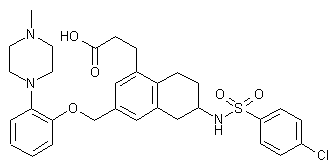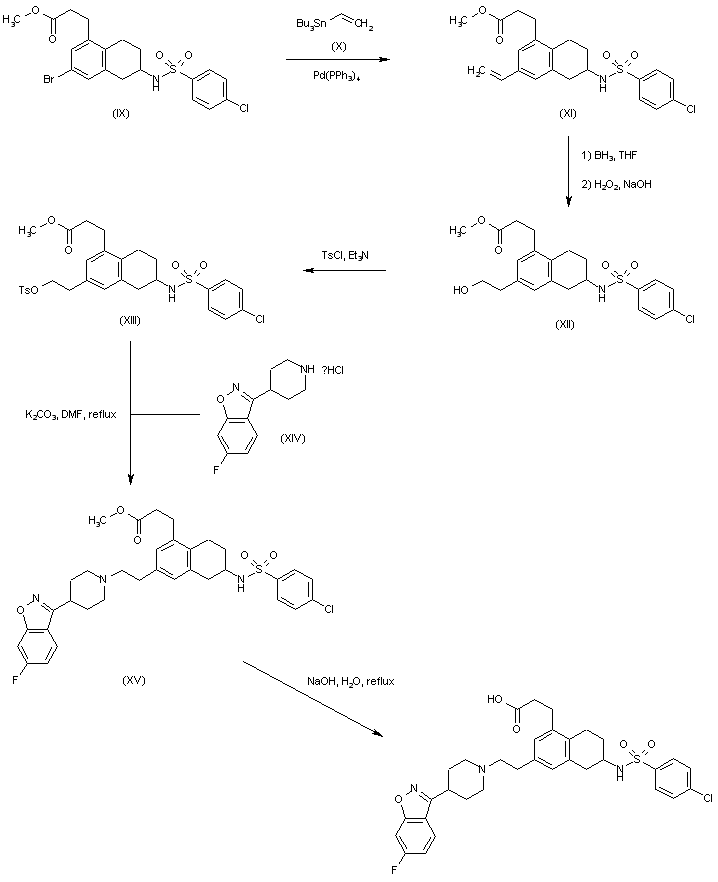 Heck reaction of aryl bromide (IX) with vinyl tributyltin (X) in the presence of palladium catalyst gave the vinyl tetrahydronaphthalene (XI), which was converted to the primary alcohol (XII) by means of hydroboration with borane in THF followed by oxidative treatment with H2O2 and NaOH. Reaction of alcohol (XII) with p-toluenesulfonyl chloride and Et3N produced the corresponding tosylate (XIII) (1). This was then condensed with 6-fluoro-3-(4-piperidinyl)benzisoxazole (XIV), yielding adduct (XV). Finally, basic hydrolysis of the ester group of (XIV) provided the title carboxylic acid.