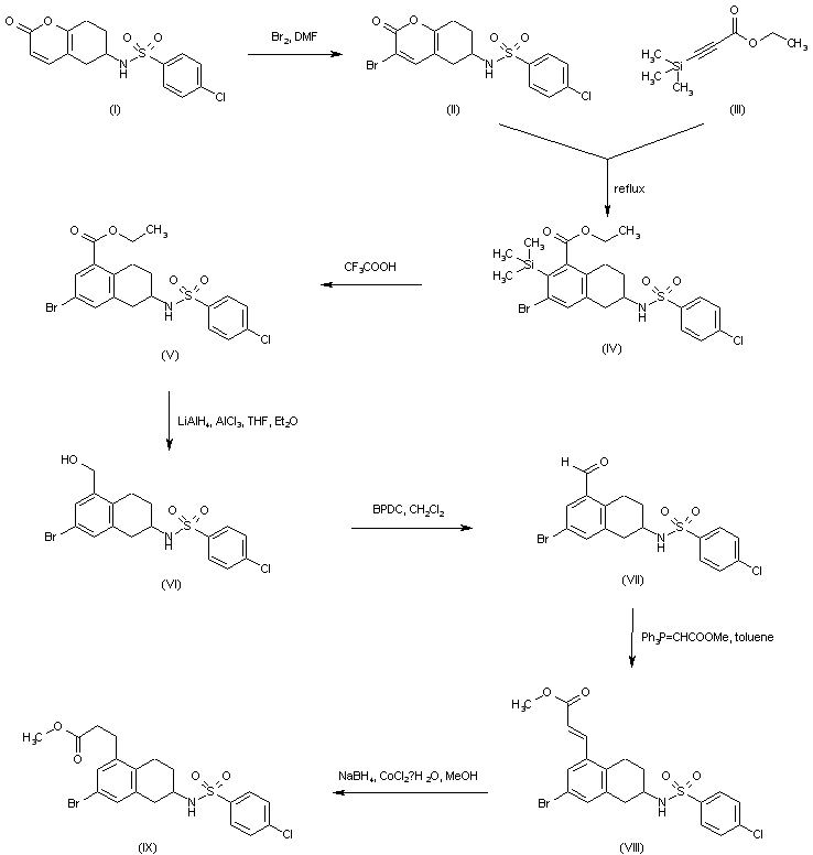Bromination of the coumarin derivative (I) with Br2 in DMF afforded the bromo coumarin (II). Diels-Alder cycloaddition between bromo coumarin (II) and ethyl 3-(trimethylsilyl)propiolate (III) with concomitant decarboxylation furnished the tetrahydronaphthalene (IV). After desilylation of (IV) with trifluoroacetic acid, the resultant ester (V) was reduced to alcohol (VI) using the combination LiAlH4-AlCl3. Further oxidation of the alcohol function of (VI) to aldehyde (VII) was performed with 4-benzylpyridinium dichromate (BPDC) in CH2Cl2. Wittig reaction of aldehyde (VII) with methyl (triphenylphosphoranylidene)acetate produced the arylacrylate ester (VIII), which was then reduced to the saturated ester (IX) employing NaBH4 in the presence of CoCl2.