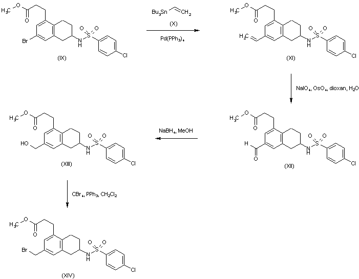 Heck reaction of aryl bromide (IX) with vinyl tributyltin (X) in the presence of palladium catalyst gave the vinyl tetrahydronaphthalene (XI), which was subjected to oxidative double-bond cleavage to aldehyde (XII) using NaIO4 in the presence of a catalytic amount of OsO4. Aldehyde reduction with NaBH4 provided alcohol (XIII). This was then converted to the corresponding bromide (XIV) by treatment with carbon tetrabromide and triphenylphosphine.