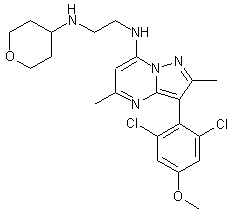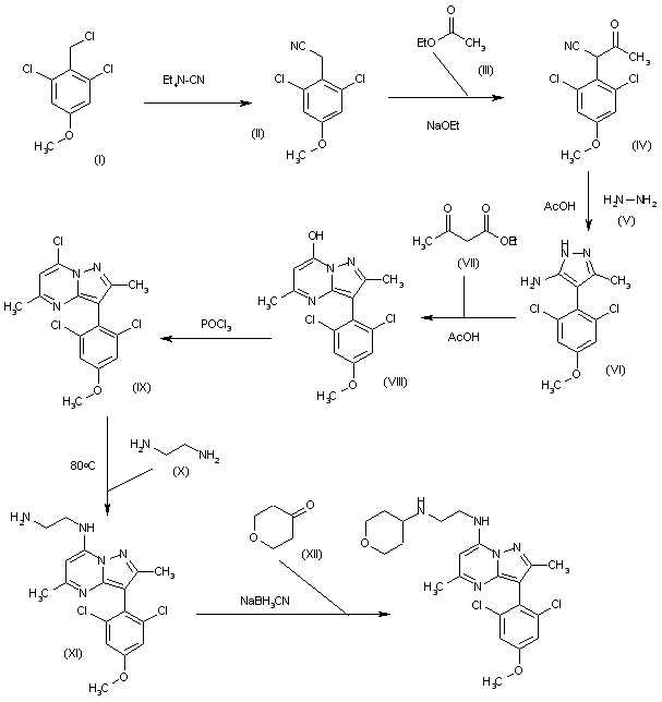 The reaction of 2,6-dichloro-4-methoxybenzyl chloride (I) with tetraethylammonium cyanide in refluxing dichloromethane gives 2-(2,6-dichloro-4-methoxyphenyl)acetonitrile (II), which is condensed with ethyl acetate (III) by means of sodium ethoxide in refluxing ethanol to yield the 3-oxobutyronitrile (IV). The cyclization of (IV) with hydrazine (V) by means of HOAc in refluxing benzene affords the aminopyrazole (VI), which is further cyclized with ethyl acetoacetate (VII) in refluxing acetic acid to provide 3-(2,6-dichloro-4-methoxyphenyl)-2,5-dimethylpyrazolo[1,5-a]pyrimidin-7-ol (VIII). The reaction of (VIII) with refluxing POCl3 furnishes the corresponding chloro derivative (IX), which is allowed to react with ethylenediamine (X) in hot acetonitrile to give 7-(2-aminoethylamino)-3-(2,6-dichloro-4-methoxyphenyl)-2,5-dimethylpyrazolo[1,5-a]pyrimidine (XI). Finally, this compound is reductocondensed with tetrahydropyran-4-one (XII) by means of sodium cyanoborohydride in methanol/HOAc to yield the target CP-671906-01.