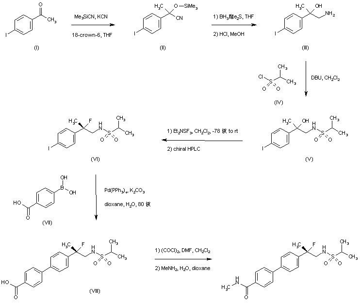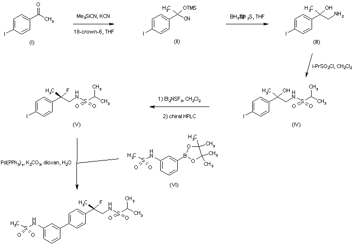 Addition of cyanotrimethylsilane to 4?iodoacetophenone (I) provided the O-silylated cyanohydrin (II), which was subsequently reduced to the amino alcohol (III) employing borane-dimethyl sulfide complex. Acylation of (III) with 2-propanesulfonyl chloride gave sulfonamide (IV). The hydroxyl group of (IV) was then fluorinated by means of diethylaminosulfur trifluoride, and the resultant racemic fluoride was resolved by chiral HPLC. Finally, Suzuki coupling of the required (S)-enantiomer (V) with boronic ester (VI) yielded the title biphenyl derivative.