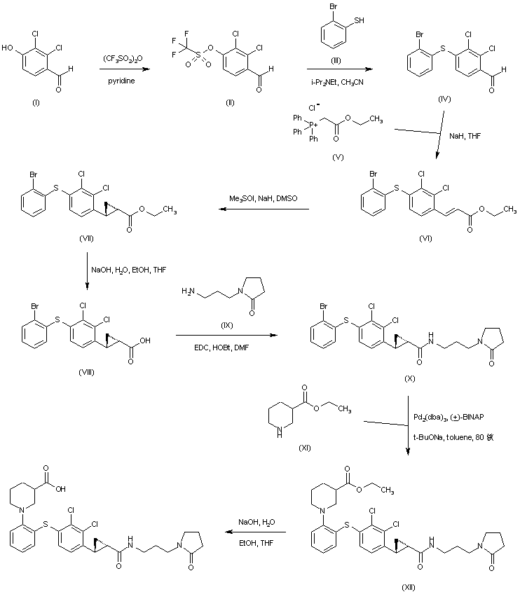 2,3-Dichloro-4-hydroxybenzaldehyde (I) was converted to the corresponding aryl triflate (II), which was subsequently condensed with 2-bromothiophenol (III), yielding the diaryl sulfide (IV). Wittig reaction of aldehyde (IV) with the ylide resulting from the phosphonium salt (V) afforded the unsaturated ester (VI). Cycloaddition between (VI) and the in situ-generated dimethylsulfoxonium methylide gave rise to the cyclopropane derivative (VII). After basic hydrolysis of the ethyl ester (VII), the resultant carboxylic acid (VIII) was coupled with 1-(3-aminopropyl)-2-pyrrolidinone (IX), providing amide (X). Displacement of the aryl bromide group of (X) with ethyl nipecotate (XI) in the presence of BINAP and Pd catalysts furnished the piperidine-substituted compound (XII). The ethyl ester group of (XII) was finally hydrolyzed to the target carboxylic acid under basic conditions.