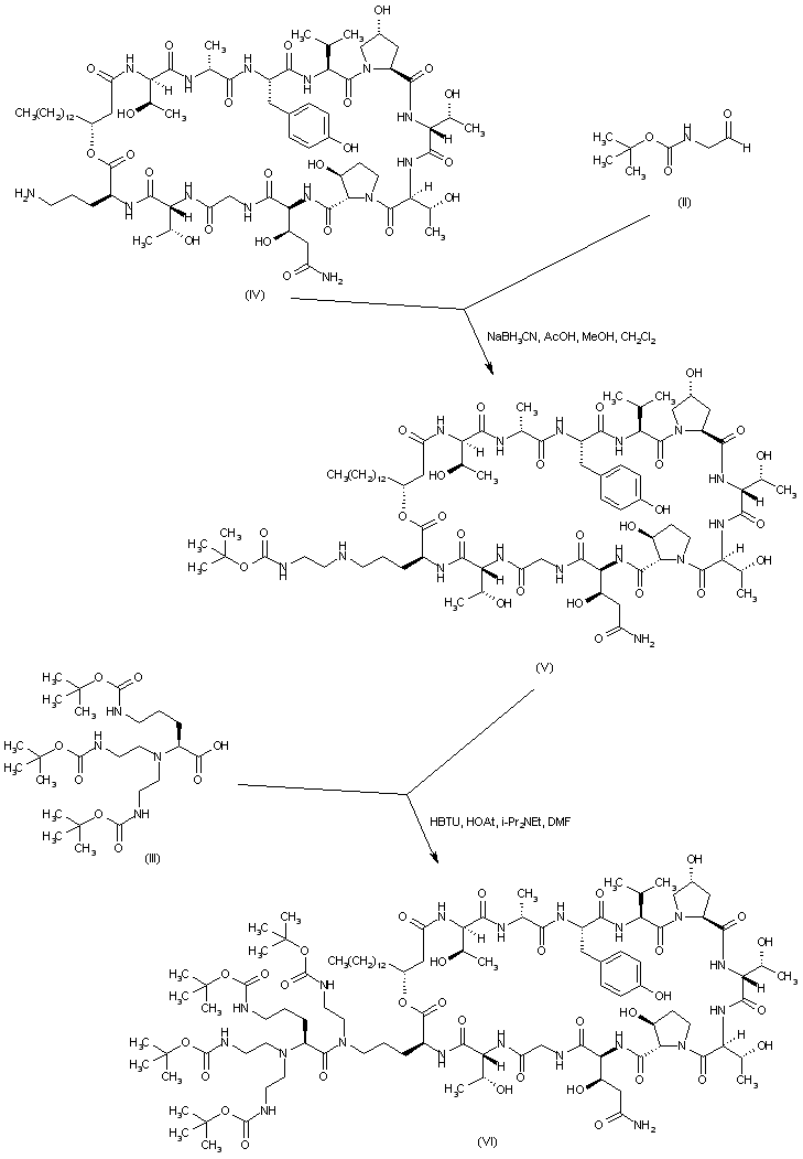 The natural macrocyclic depsipeptide RO-0093655 (IV) was subjected to reductive alkylation with N-Boc-aminoacetaldehyde (II), yielding the mono-protected diamino compound (V). Subsequent acylation of amine (V) with the ornithine derivative (III) provided the corresponding amide (VI).