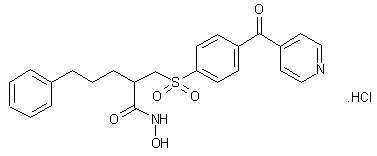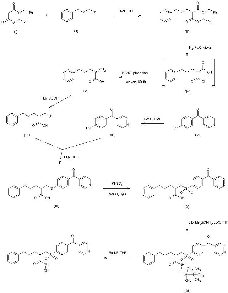 Alkylation of the sodium salt of dibenzyl malonate (I) with 1-bromo-3-phenylpropane (II) afforded the (phenylpropyl)malonate (III). The benzyl ester groups of (III) were removed by hydrogenolysis in the presence of Pd/C to produce the intermediate malonic acid (IV). Subsequent condensation of diacid (IV) with formaldehyde in the presence of piperidine proceeded with concomitant decarboxylation, yielding 2-methylene-5-phenylpentanoic acid (V). Addition of HBr to the unsaturated acid (V) gave bromide (VI). Condensation of (VI) with thiophenol (VIII), prepared by nucleophilic displacement of 4-(4-chlorobenzoyl)pyridine (VI) with sodium hydrogen sulfide, furnished the sulfide adduct (IX). This was oxidized to the corresponding sulfone (X) by treatment with Oxone(R). Conversion of (X) to the desired hydroxamic acid was carried out by coupling with O-tert-butyldimethylsilyl hydroxylamine, followed by deprotection of the resulting O-silyl hydroxamate (XI) with tetrabutylammonium fluoride.