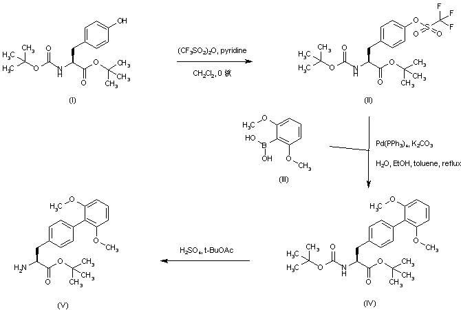 N-Boc-L-tyrosine tert-butyl ester (I) was converted to the aryl triflate (II) by means of trifluoromethanesulfonic anhydride and pyridine. Palladium-catalyzed coupling of triflate (II) with 2,6-dimethoxyphenylboronic acid (III) furnished the biphenyl compound (IV). The N-Boc protecting group of (IV) was then selectively removed by treatment with sulfuric acid in tert-butyl acetate, yielding amino ester (V).