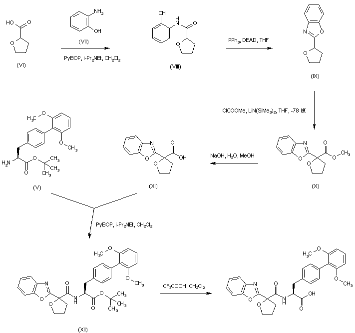 Coupling of 2-tetrahydrofuroic acid (VI) with ortho-aminophenol (VII) by means of PyBOP gave the corresponding ortho-hydroxyanilide (VIII), which was cyclized to the benzoxazole (IX) in the presence of DEAD and triphenylphosphine. The lithium derivative of (IX) was acylated with methyl chloroformate to produce the carboxylate ester (X). Acid (XI), generated by basic hydrolysis of ester (X), was then coupled with amino ester (V) to afford amide (XII). The tert-butyl ester group of (XII) was finally cleaved to the title carboxylic acid by treatment with trifluoroacetic acid.