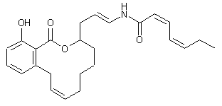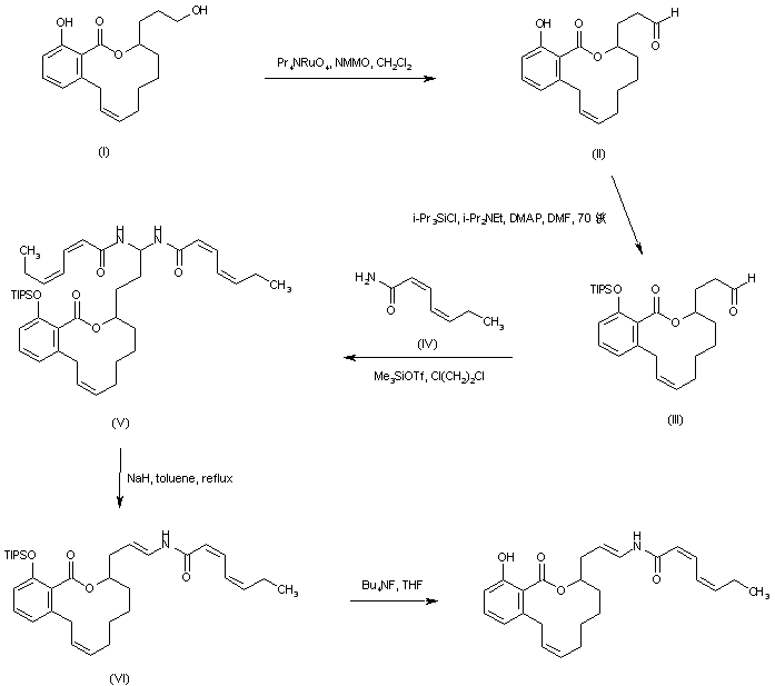 | 合成路线图解说明: The previously reported alcohol (I) was used as the starting material for the synthesis of the title compound. Alcohol (I) was oxidized to aldehyde (II) using N-methylmorpholine-N-oxide in the presence of a catalytic amount of tetrapropylammonium perruthenate. The phenolic hydroxyl group of (II) was subsequently protected as the silyl ether (III) by treatment with triisopropylsilyl chloride. The symmetrical N,N-bis-acylated aminal (V) was synthesized by condensation of aldehyde (III) with amide (IV) in the presence of trimethylsilyl triflate. Elimination of one amide moiety of (V) with NaH in refluxing toluene produced a mixture of (E)- and (Z)-enamides, from which the desired (E)-isomer (VI) could be separated by flash chromatography either at this point or after the next step. Finally, desilylation with tetrabutylammonium fluoride in THF furnished the deprotected compound. |