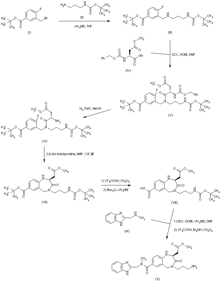 Condensation of tert-butyl 4-fluoro-3-(bromomethyl)benzoate (I) with N-Boc-1,3-propanediamine (II) afforded the aminomethyl benzoate derivative (III). This was coupled with N-Cbz-L-aspartic acid beta-methyl ester (IV), yielding amide (V). After hydrogenolysis of the carbobenzoxy protecting group of (V), the resultant fluoro amine (VI) was cyclized to the benzodiazepinone (VII) upon treatment with 2,6-di-tert-butylpyridine in hot NMP. Acidic cleavage of both the tert-butyl ester and the N-Boc groups of (VII), followed by reprotection of the amine with Boc2O, furnished the N-Boc acid (VIII). This was then coupled to 2-(methylaminomethyl)benzimidazole (IX) to afford, after acidic Boc group cleavage, the amino amide (X).