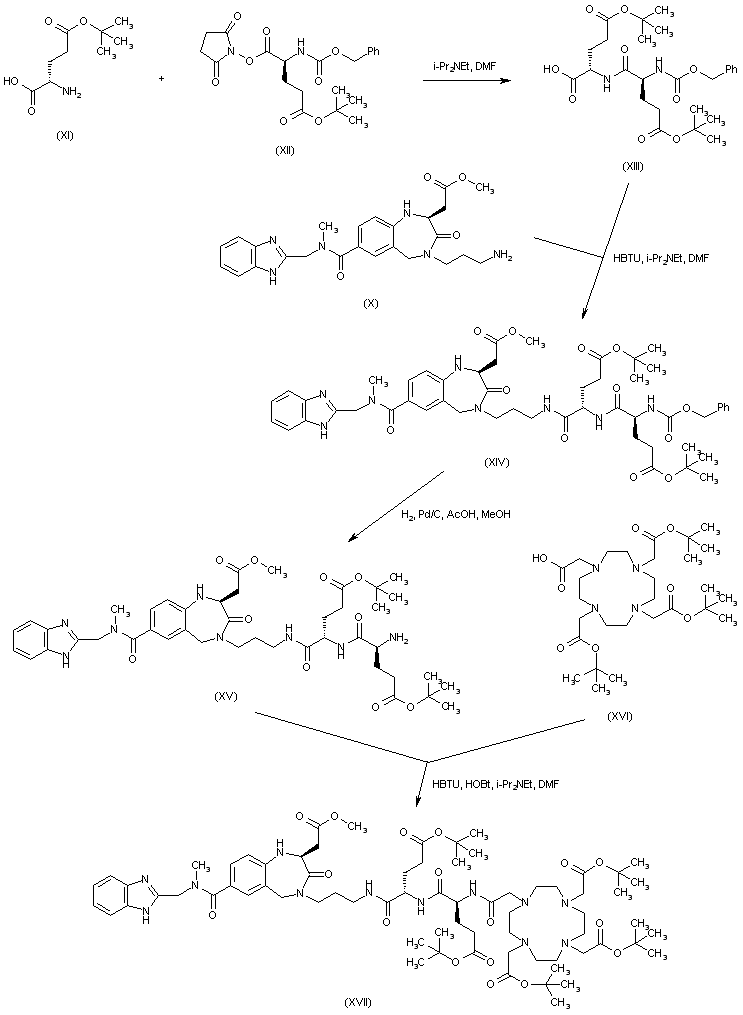 Coupling between gamma-tert-butoxy glutamic acid (XI) and gamma-tert-butoxy-N-Cbz-glutamic acid succinimidyl ester (XII) produced the protected dipeptide (XIII). This was further coupled to the intermediate amine (X) to furnish the corresponding amide (XIV). After hydrogenolysis of the N-Cbz protecting group of (XIV), the resultant amine (XV) was acylated with tetraazacyclododecanetetraacetic acid tri-tert-butyl ester (XVI), yielding the amide adduct (XVII).