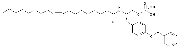 | 合成路线图解说明: N-Boc-O-benzyltyrosine (I) was converted to the aminoalcohol derivative (III) via conversion to the mixed anhydride (II) with isobutyl chloroformate and subsequent reduction with NaBH4. Acid cleavage of the N-Boc protecting group of (III) gave the free amine (IV), which was acylated with oleoyl chloride (V) to afford amide (VI). Phosphitylation of (VI) with N,N-diisopropyl di-tert-butyl phosphoroamidite in the presence of tetrazole, followed by oxidation of the intermediate phosphite with hydrogen peroxide, furnished the phosphate (VII). The tert-butyl phosphate ester groups of (VII) were finally cleaved by treatment with trifluoroacetic acid. |