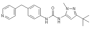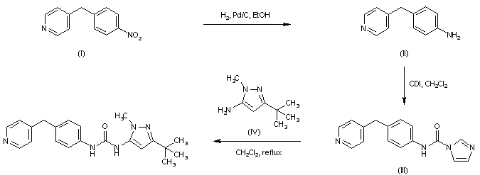 4-(4-Pyridinylmethyl)aniline (II) was prepared by catalytic hydrogenation of the corresponding nitro derivative (I) over Pd/C. Condensation of aniline (II) with N,N?carbonyldiimidazole produced the imidazolide (III). This was then condensed with 5-amino-3-tert-butyl-1-methylpyrazole (IV) to furnish the target urea.