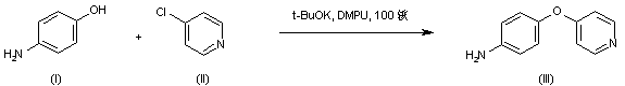 Condensation of 4-aminophenol (I) with 4-chloropyridine (II) in the presence of potassium tert-butoxide afforded the intermediate diaryl ether (III).